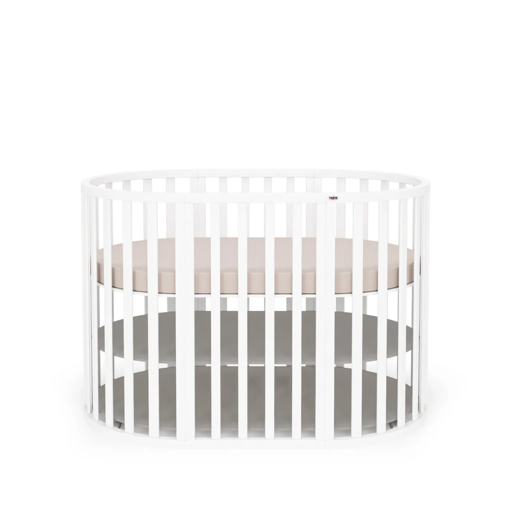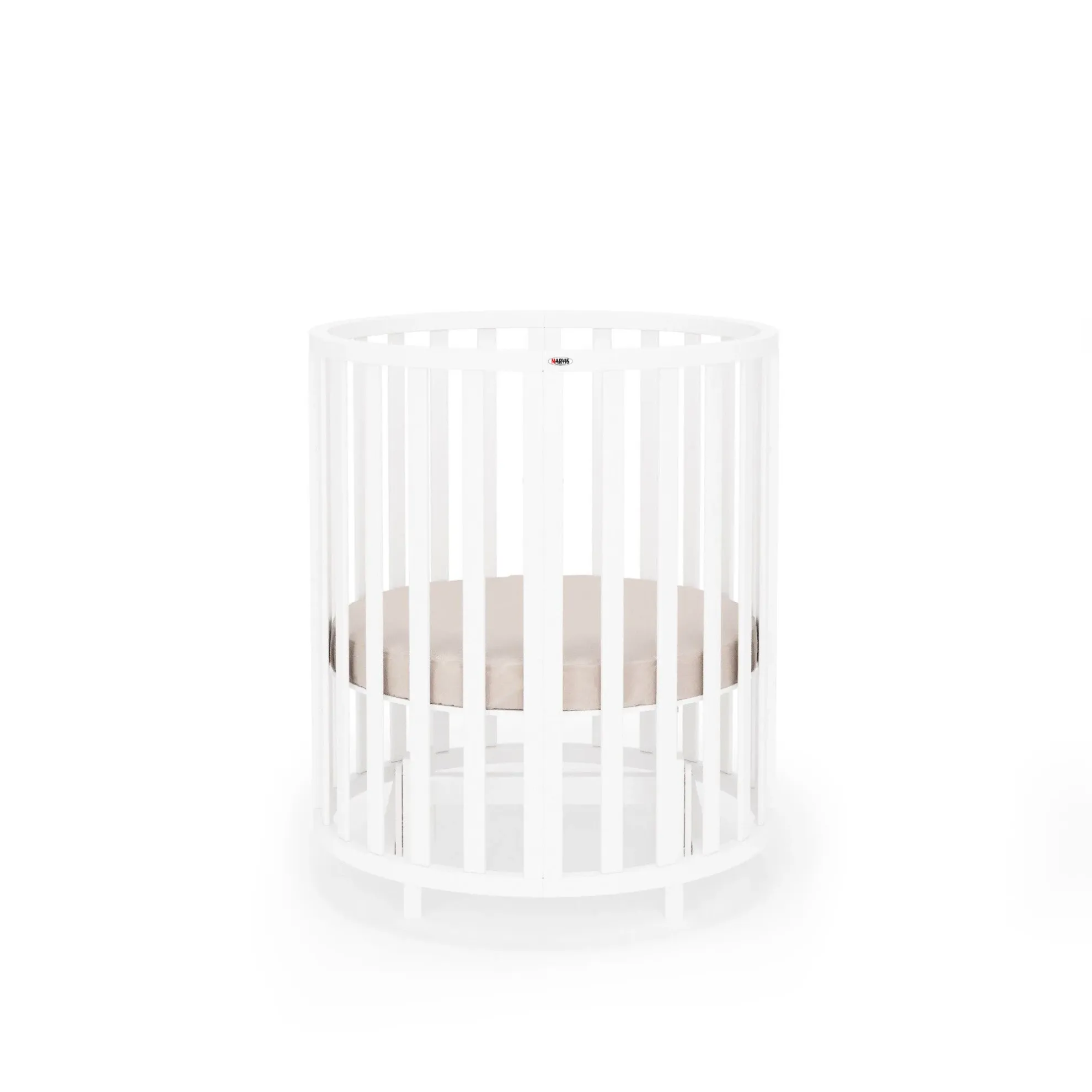 Pătuț bebe transformabil rotund/oval Maribelle 9 în 1 Alb – Ideal pentru Fiecare Etapă de Creștere a Copilului (BALANSOAR INCLUS)